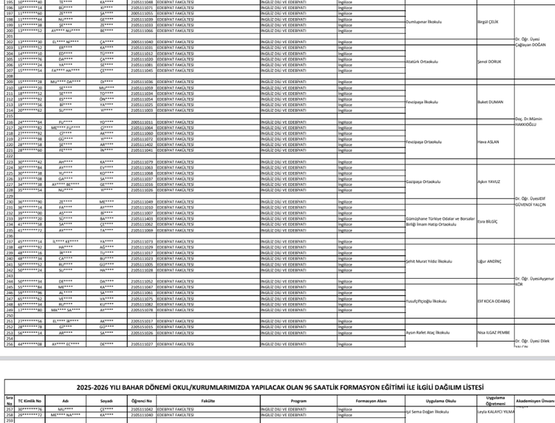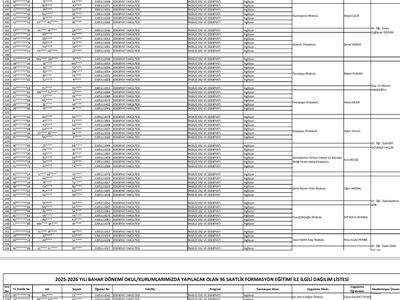 2025-2026 YILI BAHAR DÖNEMİ OKUL/KURUMLARIMIZDA YAPILACAK OLAN 96 SAATLİK FORMASYON EĞİTİMİ İLE İLGİLİ DAĞILIM LİSTESİ
