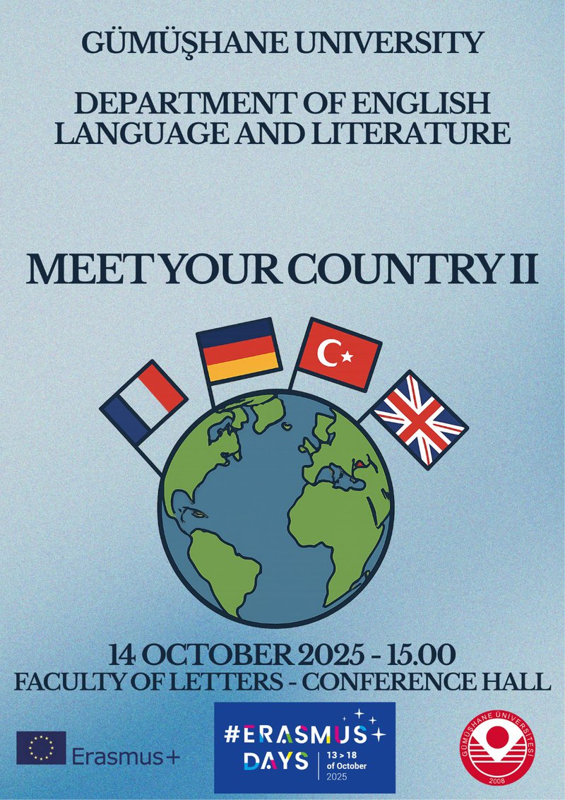 14 Ekim 2025 saat 15.00'da Edebiyat Fakültesi Konferans Salonunda gerçekleştirilecek olan "Meet Your Country II" isimli Erasmus+ etkinliğine davetlisiniz.